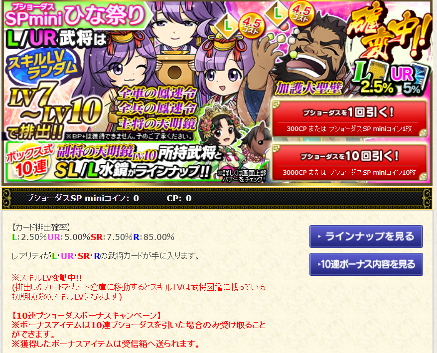 L:2.50%、UR:5.00%、SR:7.50%、R:85.00%※ブショーダスSPmini【ひな祭り】で入手したカードを破棄しても、
