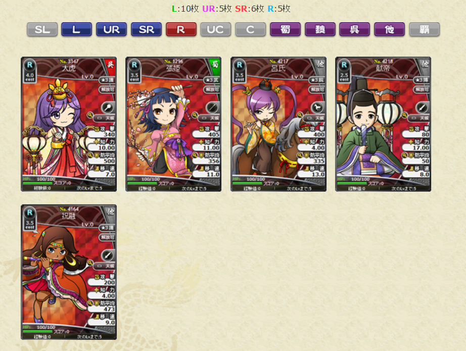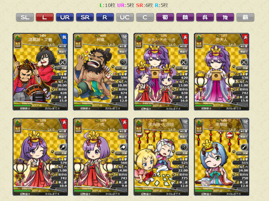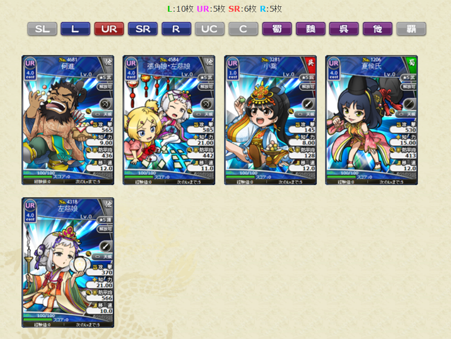 ・No.1294 L甘夫人 副将の天明鏡LV10 1枚 ・No.2309 L甄姫 副将の天明鏡LV10 1枚 ・No.3280 L周姫 副将の天明鏡LV10 1枚 ・No.4514 L王異 副将の天明鏡LV10 1枚 ・No.4232 L水鏡 水鏡透察LV1 4枚 ・No.4079 UR水鏡 水鏡鑑定LV1 4枚