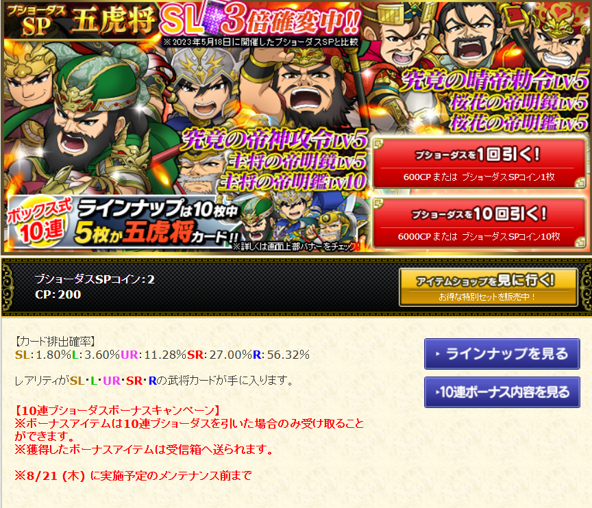<開催期間:8/14 メンテナンス終了後 – 8/21 実施予定のメンテナンス開始前>2024年に登場した五虎将カードなどもラインナップされた