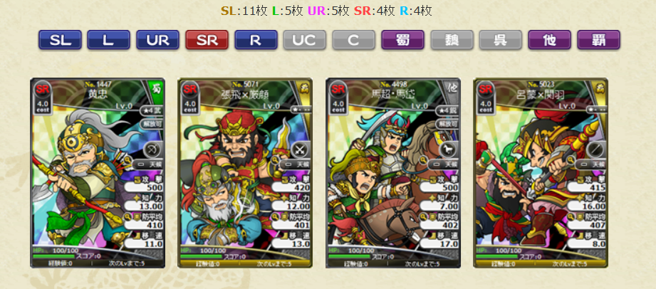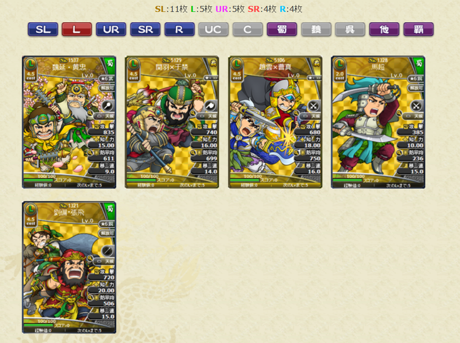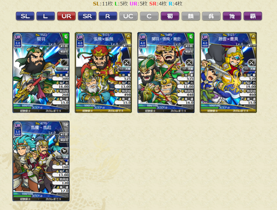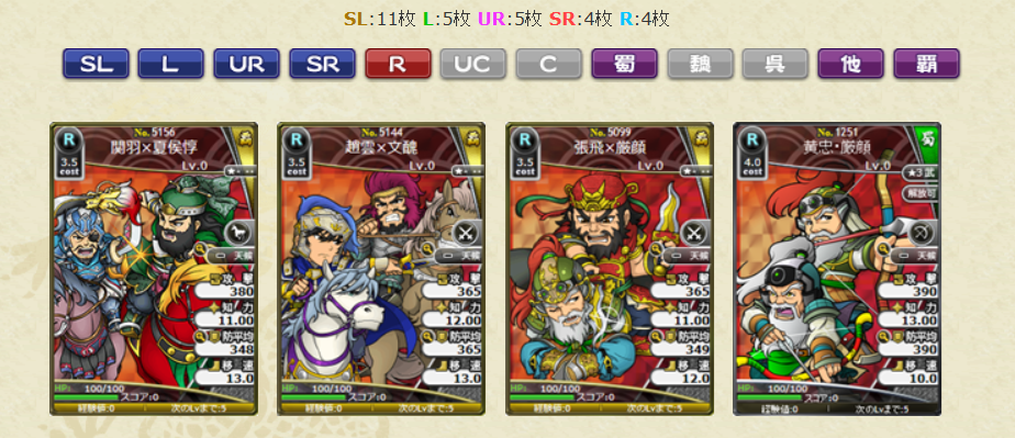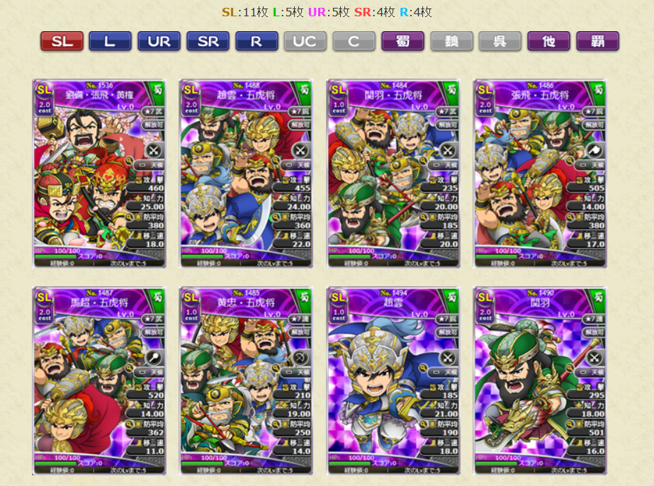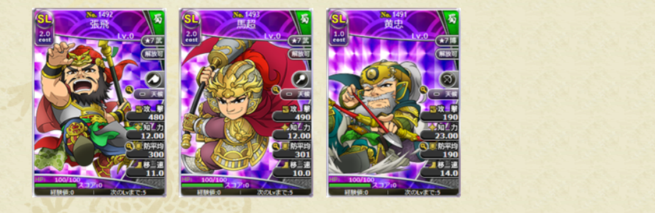 ラインナップ全カードに五虎将(関羽・張飛・趙雲・黄忠・馬超)のうち最低1人が入ってるとは。