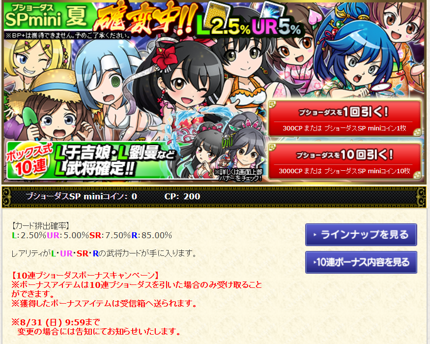 - 去年のSPmini夏より見劣りするところも(UR以上のスキルレベル10排出&副将スロットフル開放が無くなった)