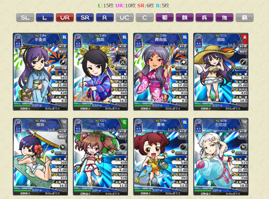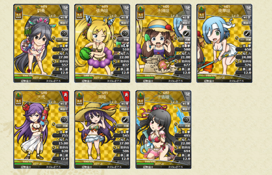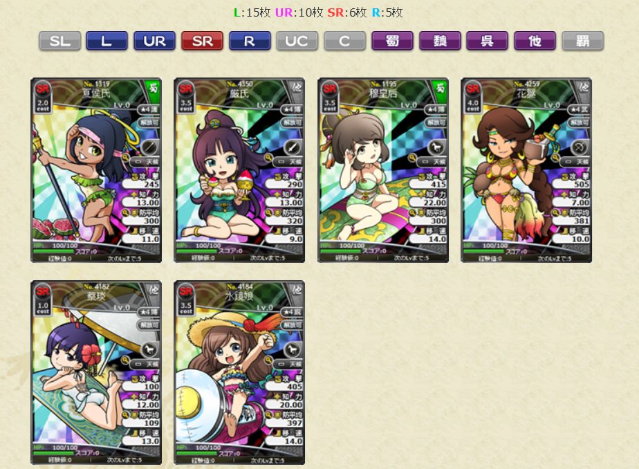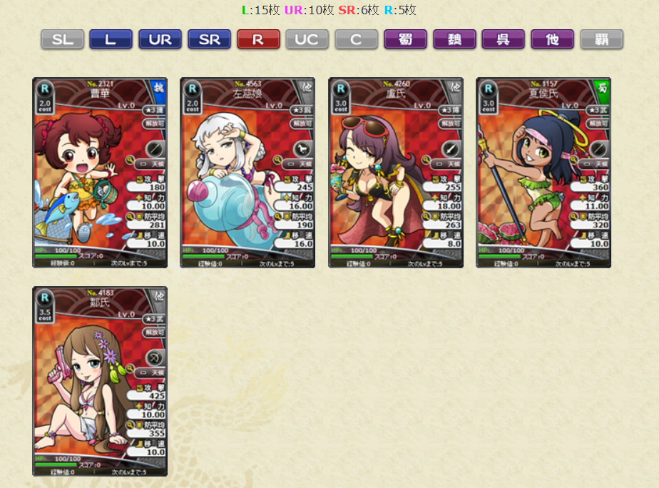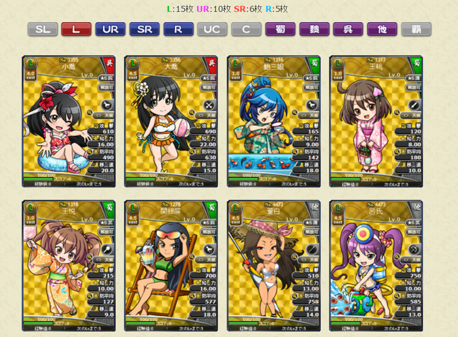 ・No.3355 L小喬 龍神の攻奪LV5 1枚 ・No.3356 L大喬 天軍の王威令LV5 1枚 ・No.1316 L鮑三娘 副将の天明鏡LV10 1枚 ・No.1317 L王桃 副将の天明鏡LV10 1枚 ・No.1318 L王悦 副将の天明鏡LV10 1枚 ・No.1278 L関銀屏 副将の天明鏡LV10 1枚 ・No.4472 L董白 副将の天明鏡LV10 1枚 ・No.4473 L呂氏 副将の天明鏡LV10 1枚 ・No.4474 L劉曼 副将の天明鏡LV10 1枚 ・No.4419 L張角娘 娘々無縫LV2 1枚 ・No.4420 L水鏡娘 娘々天恵沢LV2 1枚 ・No.4421 L南華娘 娘々大神砕LV2 1枚 ・No.3210 L大虎 龍神突貫LV4 1枚 ・No.3211 L周姫 呉の大治世LV4 1枚 ・No.4257 L于吉娘 天衣無縫LV1 1枚 ブラウザ三国志のゲーム画面より引用