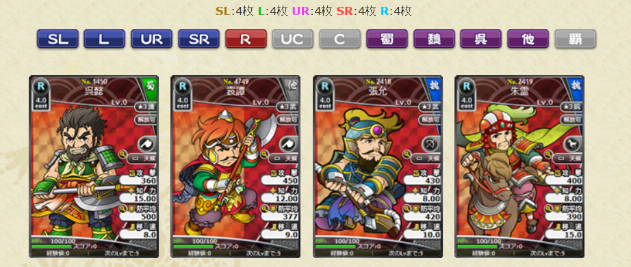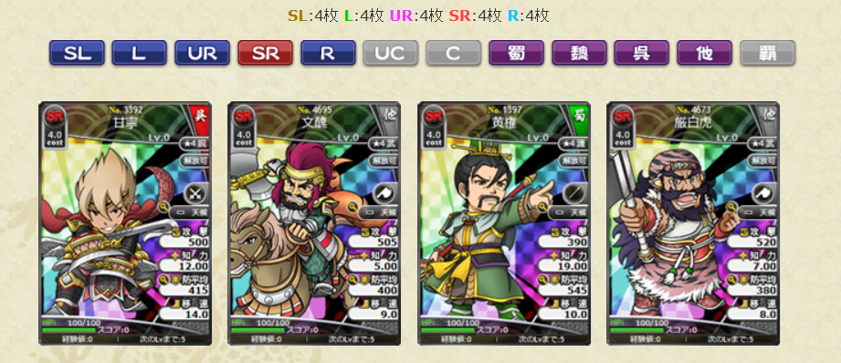 ※レアリティSR、Rの武将カードは副将スロットは未解放で排出されます。