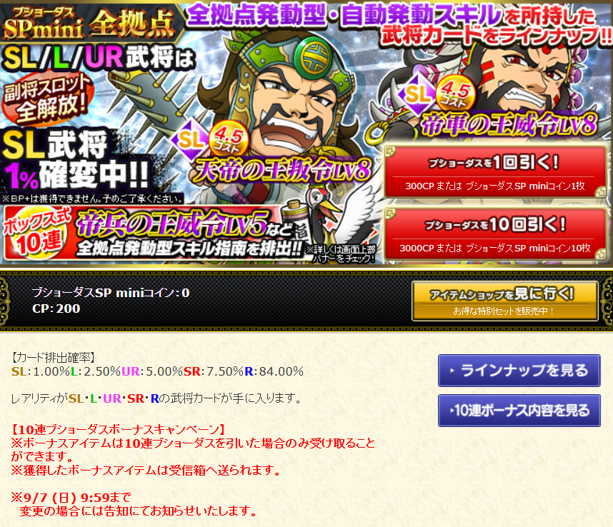 SL:1.00%、L:2.50%、UR:5.00%、SR:7.50%、R:84.00%※ブショーダスSPmini【全拠点】で入手したカードを破棄しても、