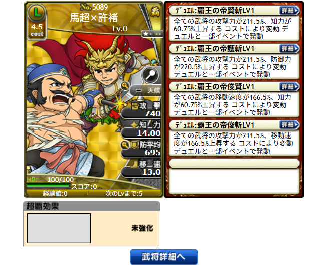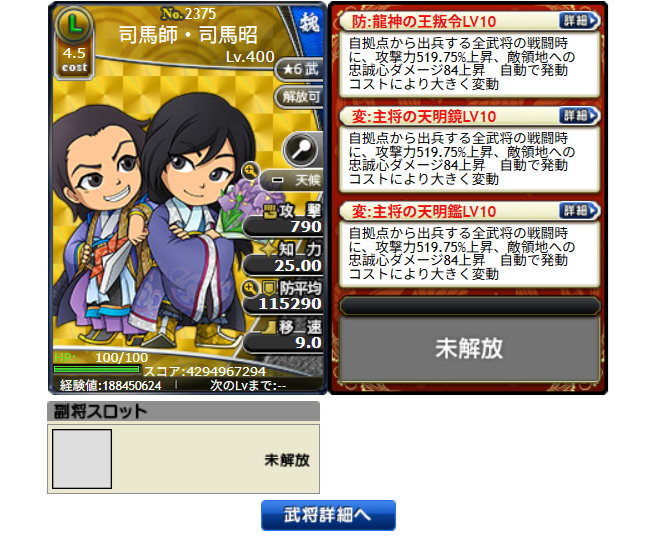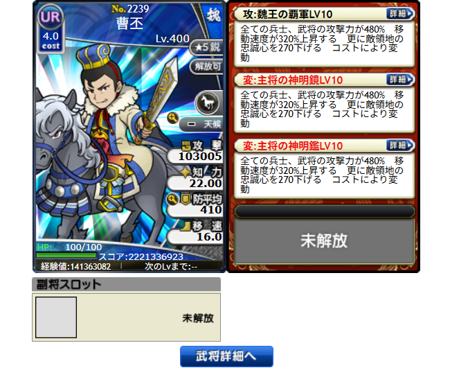 スキルレベルはオール10で、武将と兵士の攻撃力1440%上昇・移動速度960%上昇・忠誠心ダメージ810という係数を叩き出せます。