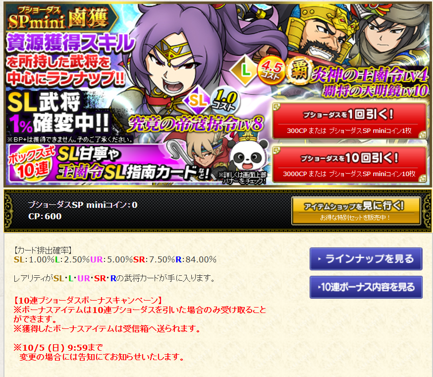 SL:1.00%、L:2.50%、UR:5.00%、SR:7.50%、R:84.00%※ブショーダスSPmini【鹵獲】で入手したカードを破棄しても、