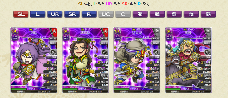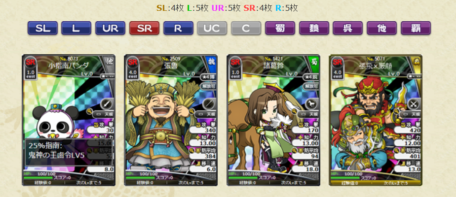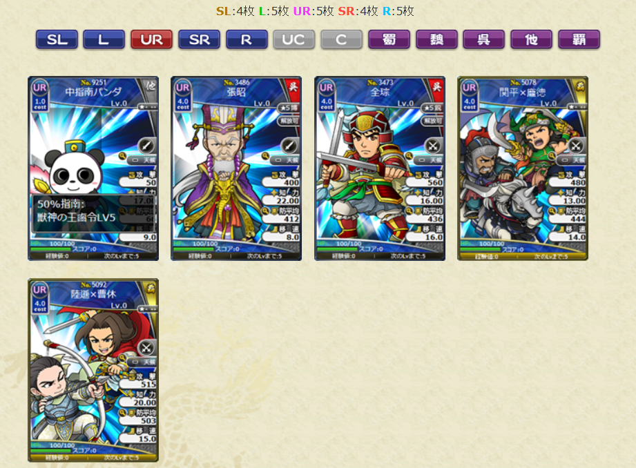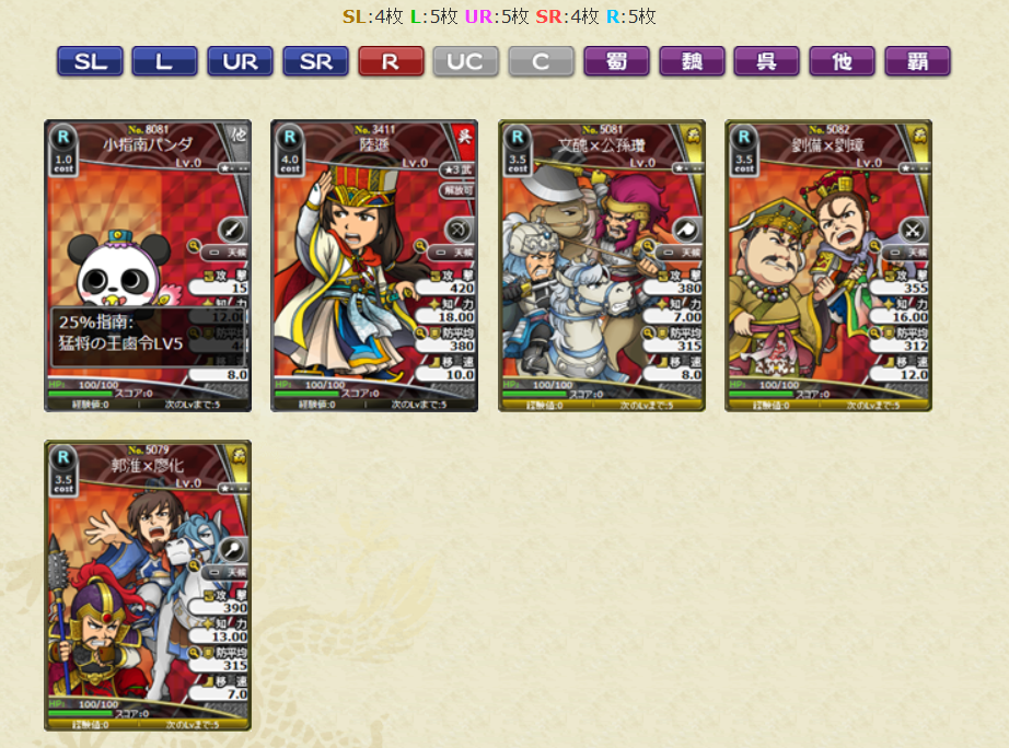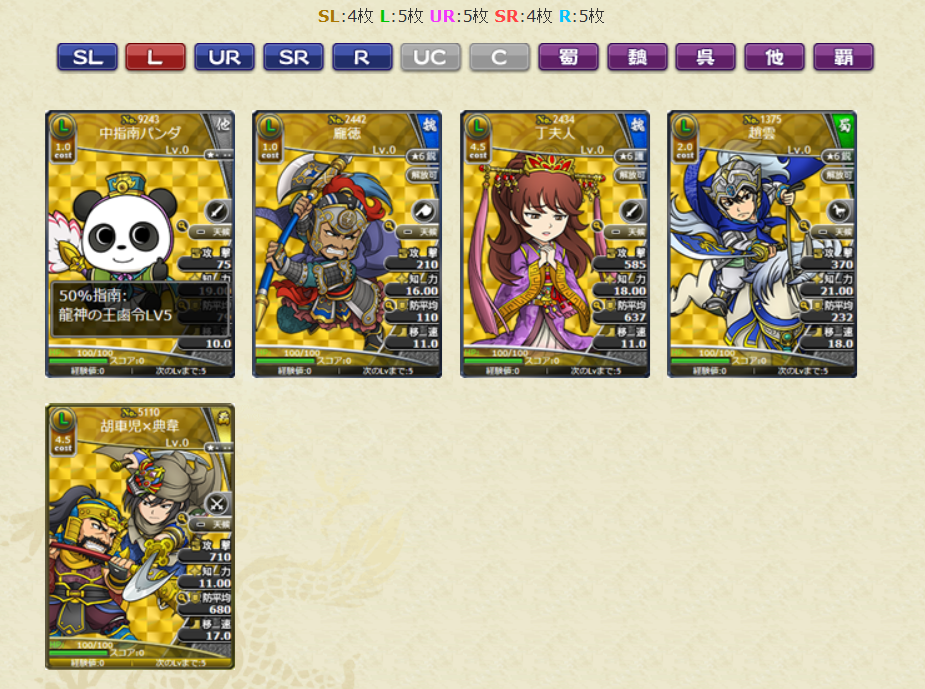 黄巾の神劫令LV21枚 ・No.2361 L鄧艾 剴切の天攻奪LV2 1枚 ・No.10645 SL指南パンダ 龍神の王鹵令LV5 1枚 ・No.10648 SL指南パンダ 獣神の王鹵令LV5 1枚 ・No.10649 L指南パンダ 鬼神の王鹵令LV5 1枚 ・No.10652 L指南パンダ 戦神の王鹵令LV5 1枚 ・No.4595 SL水鏡 水鏡達識LV1 4枚 ・No.4232 L水鏡 水鏡透察LV1 4枚 ブラウザ三国志のゲーム画面より引用