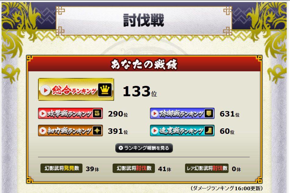 2日目の結果から差し引きすると総ダメージ2億、幻影武将20体撃破ぐらいですかね。