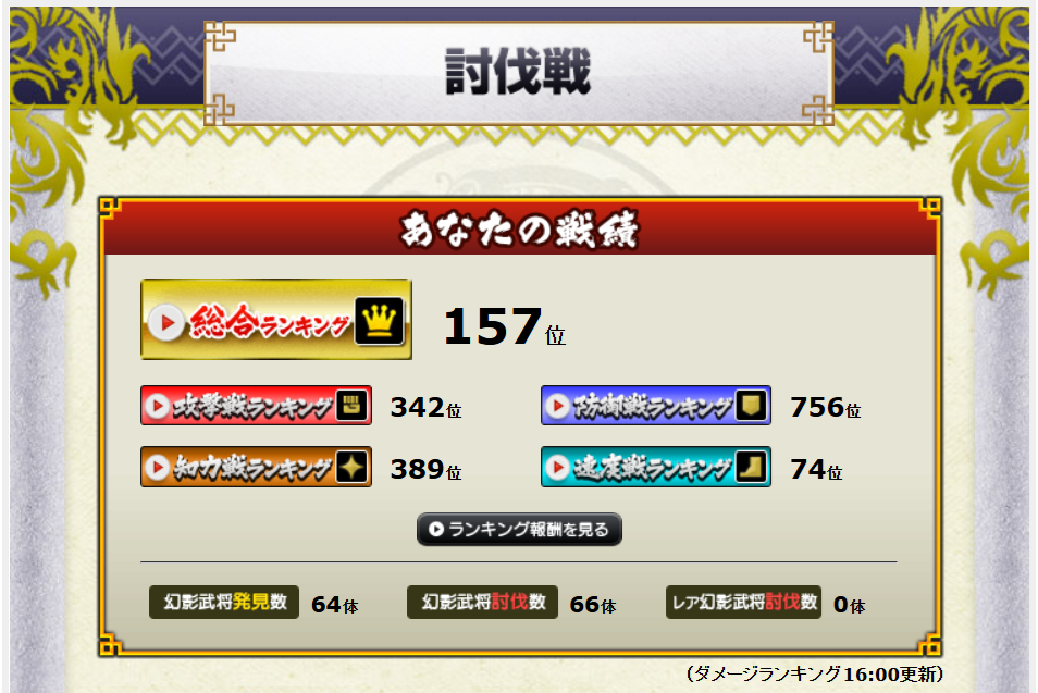 総ダメージ数6億5100万、幻影武将66体撃破となりました。