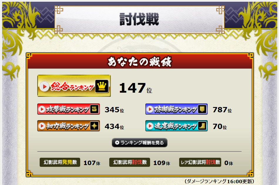 総ダメージ数11億7200万、幻影武将109体撃破です。