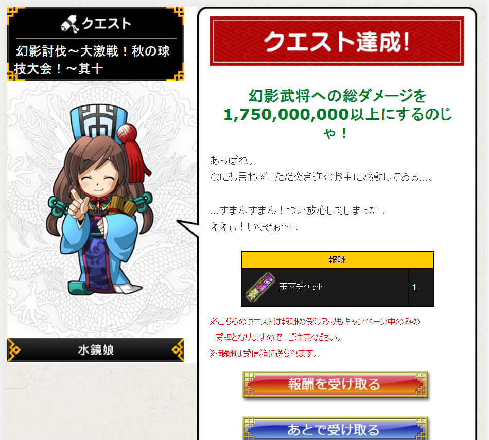 総ダメージ17億5200万、幻影武将144体撃破です。