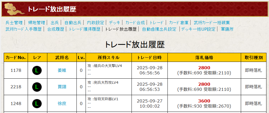 トレード市場に出したらこんな値段で売れました(L姜維は別の機会に引いた奴)。