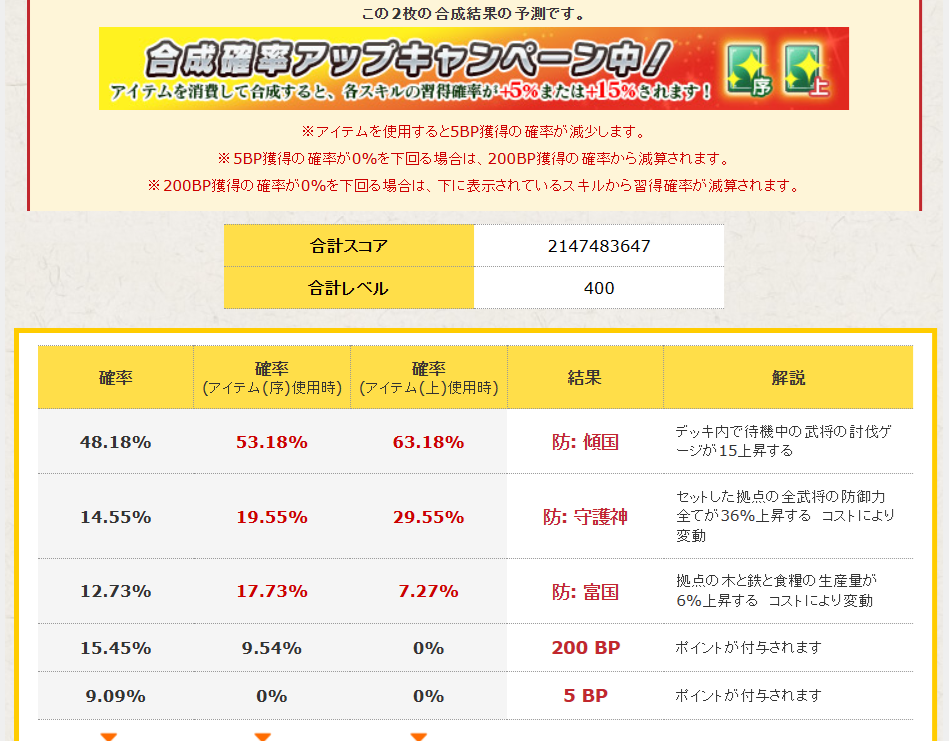 合成確率アップキャンペーン中でアイテム使わないと意図しないスキルが付くイメージあるので、ここはアイテム使います。