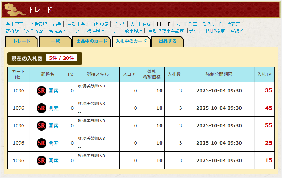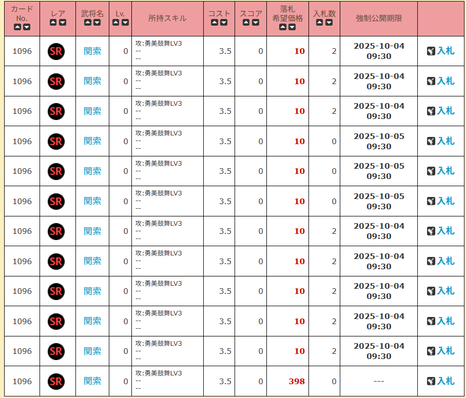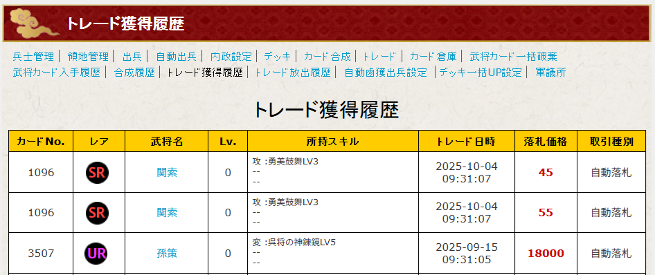 勇美鼓舞持ちのSR関索の相場(w1+2鯖)がこちら。
