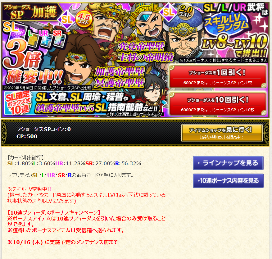 「No.3398 SL孫翊・朱治」が再登場しています。また、今回のブショーダスSP【加護】の各レアリティの排出確率は下記の通りです。
