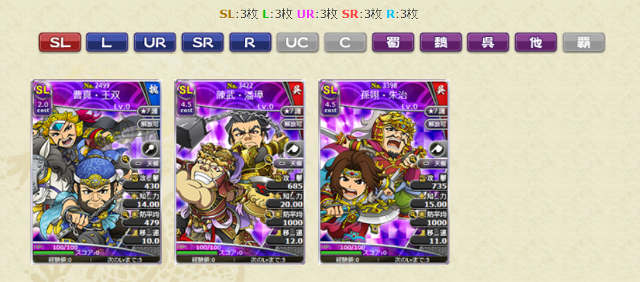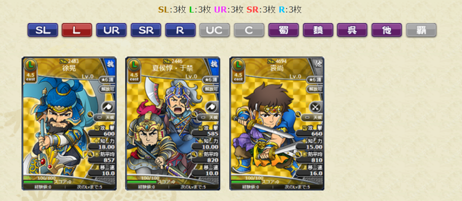 ・No.3408 SL文鴦 究竟帝聖壁LV2 1枚 ・No.3384 SL周瑜・程普 加護帝聖壁LV4 / 冥護帝聖壁LV4 1枚 ・No.1401 SL厳顔 加護帝聖壁LV8 1枚 ・No.1381 SL劉備 加護帝聖壁LV6 1枚 ・No.2366 SL董昭 加護帝聖壁LV4 1枚 ・No.10725 SL指南鶴爺 鎮護帝聖壁LV5 1枚 ・No.4595 SL水鏡 水鏡達識LV1 4枚 ※SL指南鶴爺は、レアリティSL以上の武将カードへのみスキル習得させることが可能です。