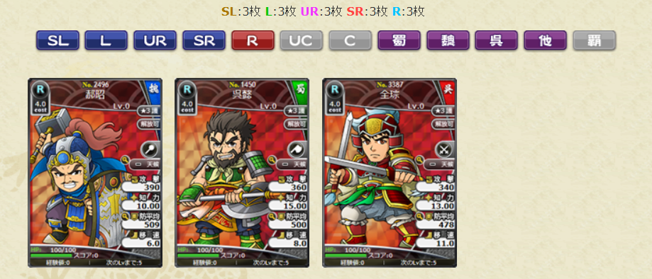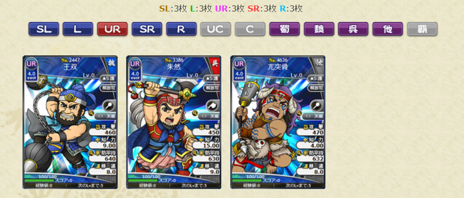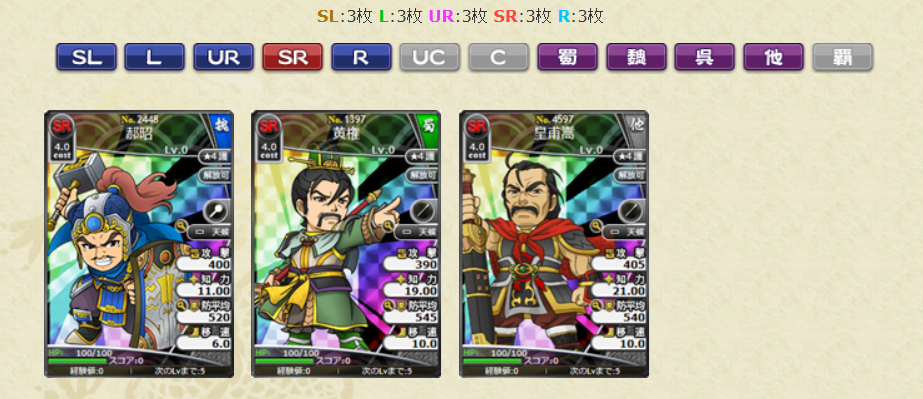 ※レアリティSR以下の武将のスキルレベルは初期所持スキルLVの状態で排出されます。