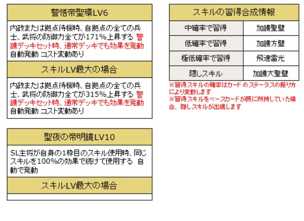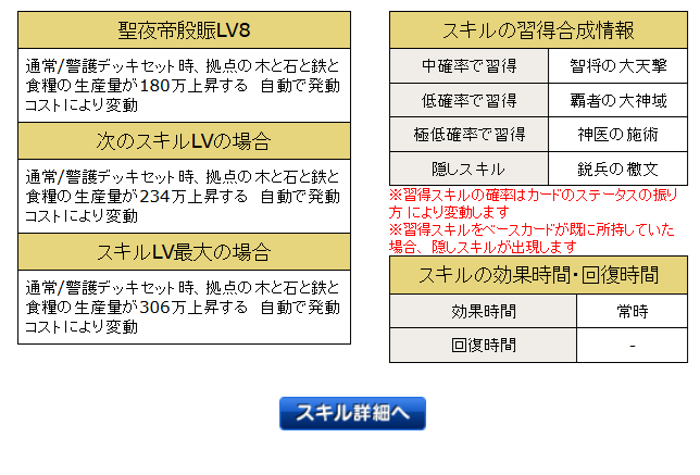 聖夜帝殷賑は木石鉄糧すべての生産量を上昇させるスキルであり、警護デッキに置いても効果があります。