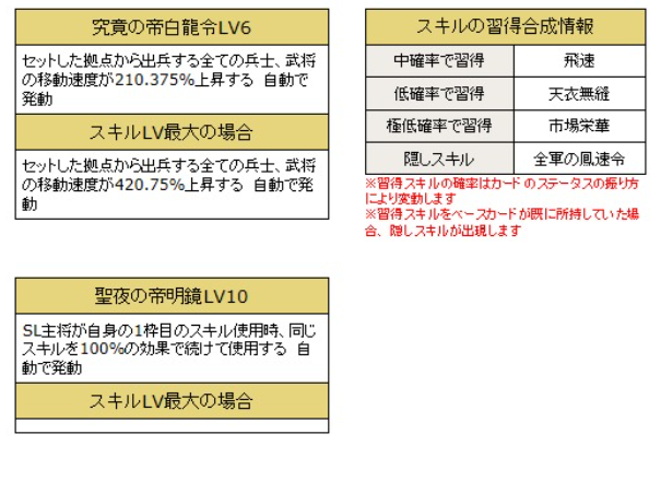仮に空いてるスキル3枠目に明鏡系スキルを付与してすべてのスキルをレベル10にすれば、兵士と武将の移動速度が1262.25%上昇となる。