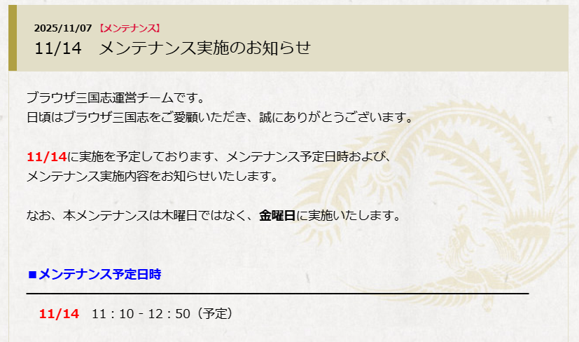 今週のメンテは今日(木曜日)ではなく明日(金曜日)です。