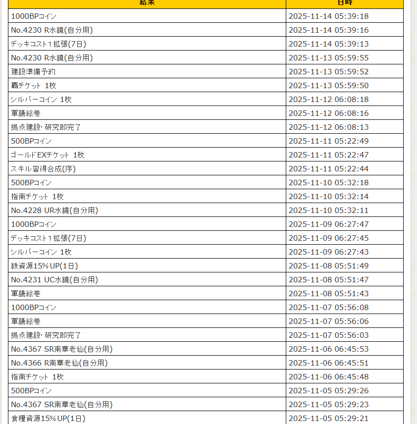 ここ10日間でシルコイン2枚、UR水鏡(自分用)1枚、デッキコスト1拡張(7日)2枚。