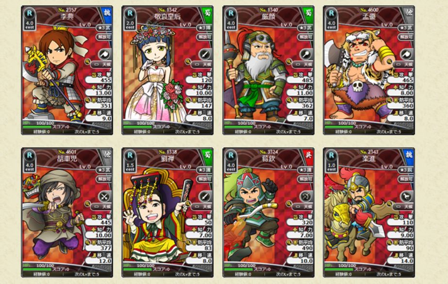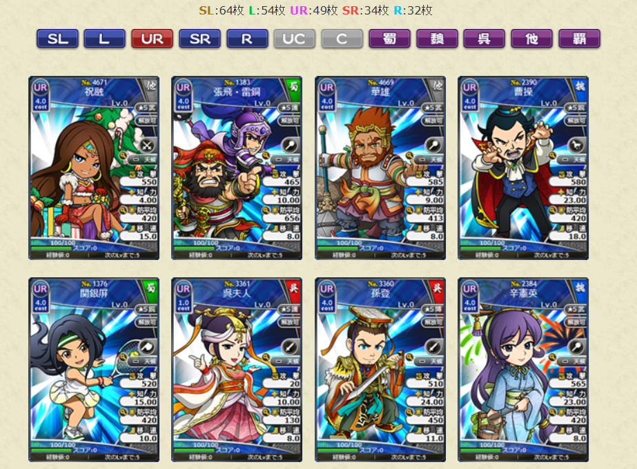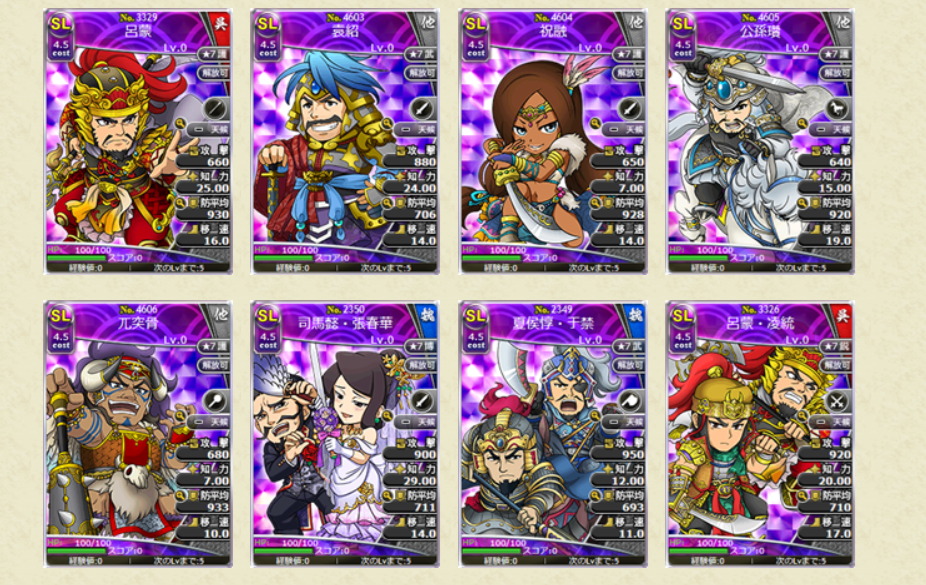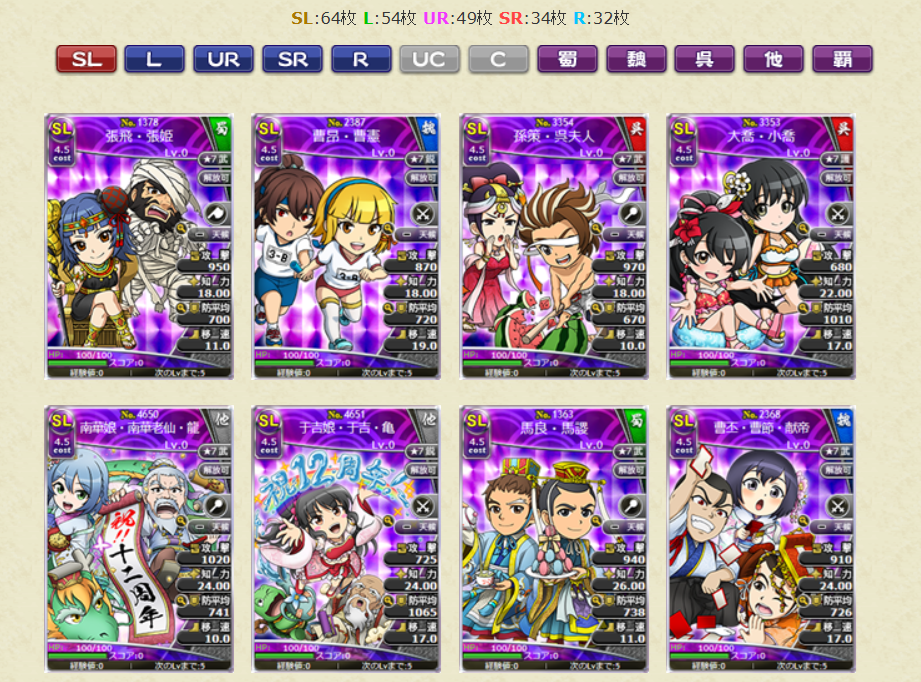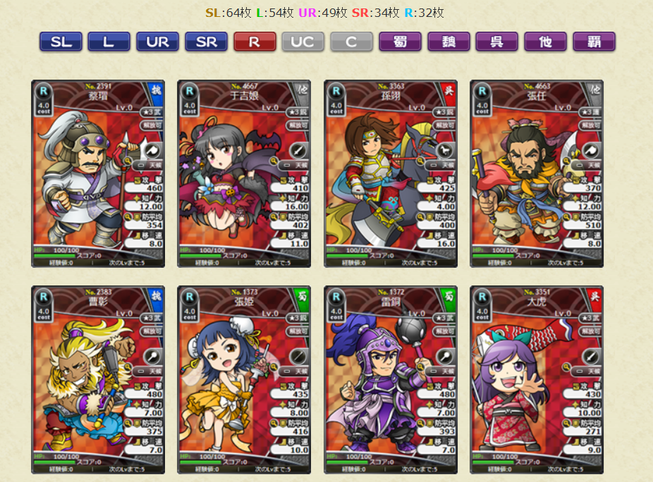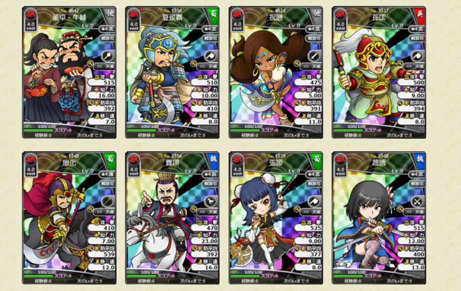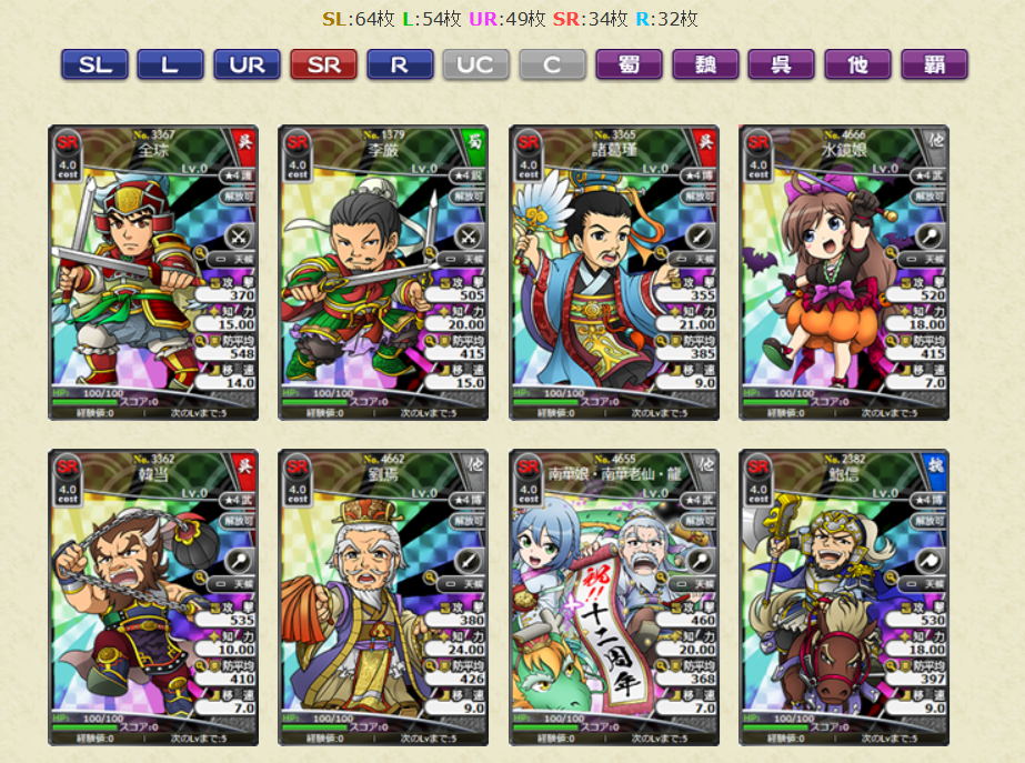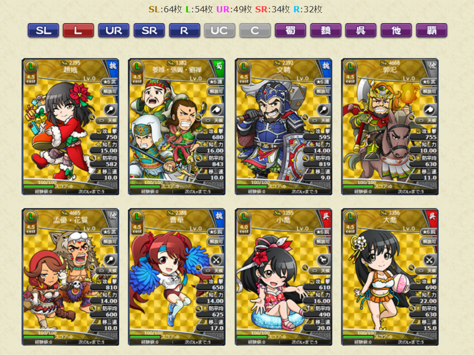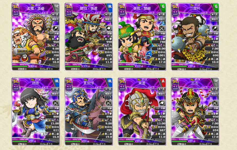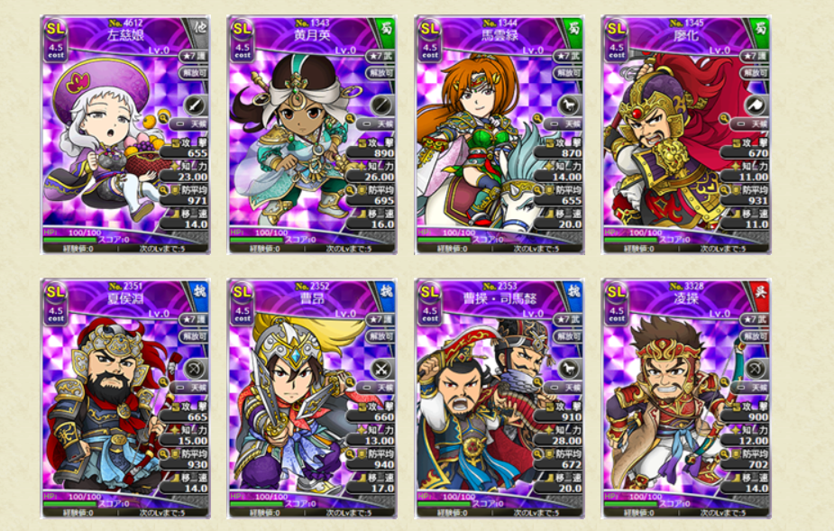 スキルの効果値についても、初期所持スキルLVの効果値となります。レアリティSLの武将カードでは