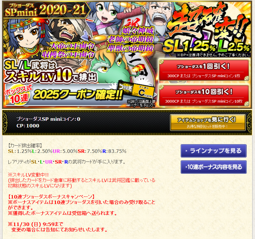 <開催期間:11/23 10:00:00 – 11/30 09:59:59>2020年、2021年に登場した武将カードがラインナップされた