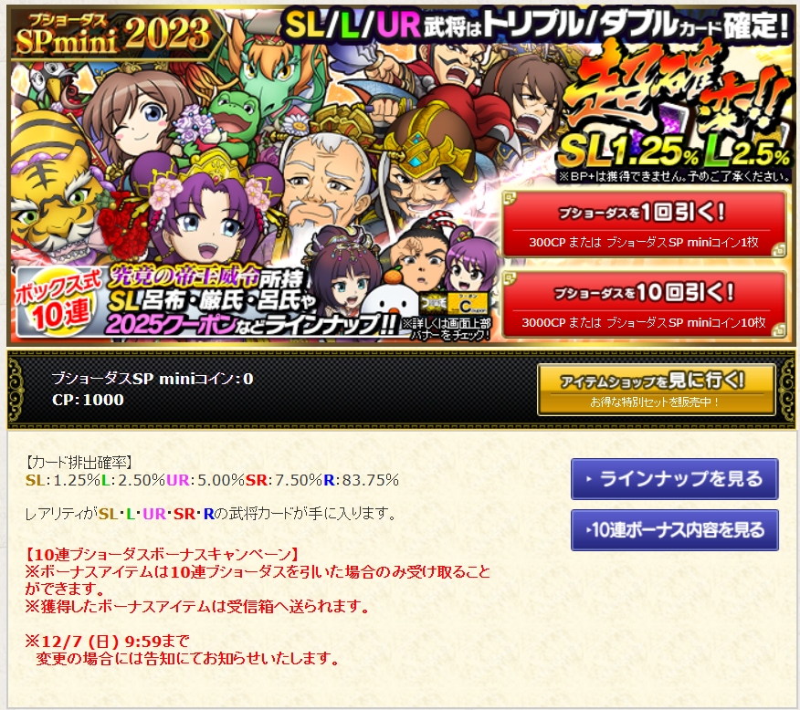 ブショーダスSPmini【2023】が開催中です。通常ラインナップのレアリティSLでは、
