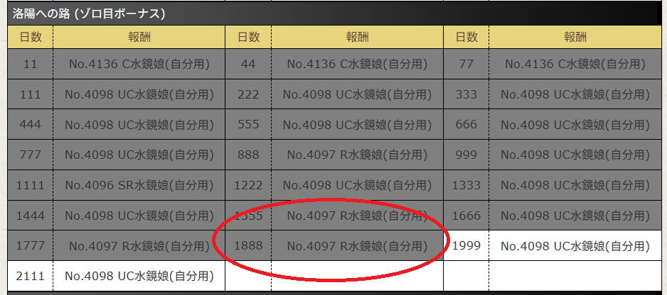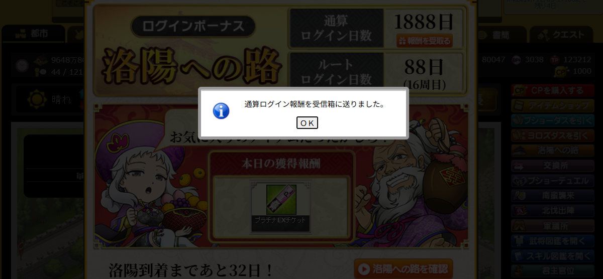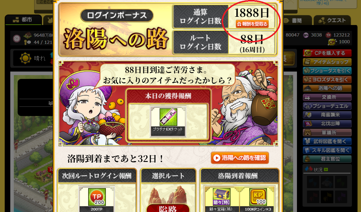 洛陽の路実装後、1日も休みなくログインしていれば今日で1888日目。