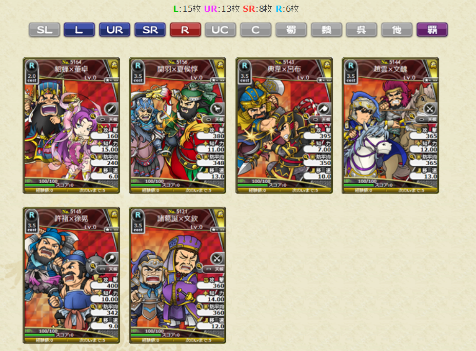 「No.5152 L鍾会×張翼」などが再登場しています!また、今回のブショーダスSP【覇】の各レアリティの排出確率は下記の通りです。