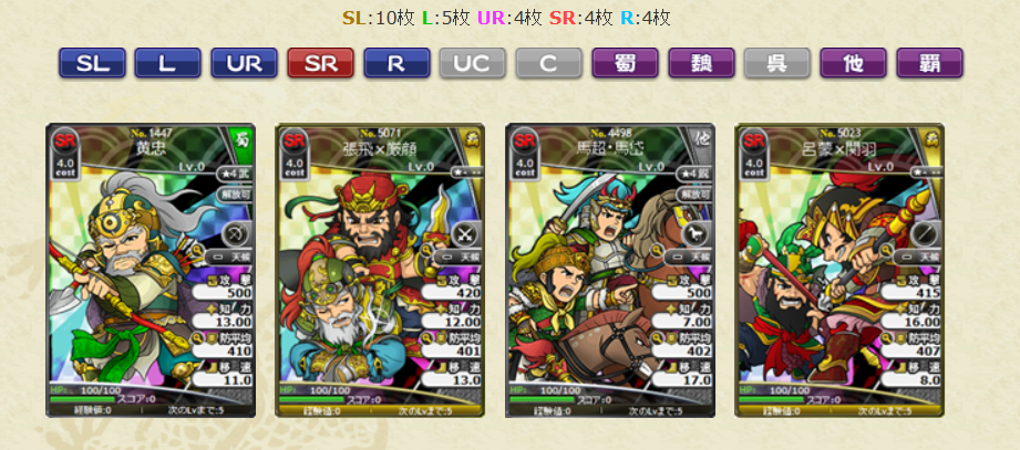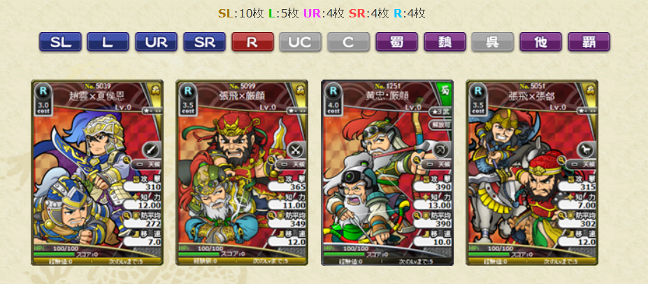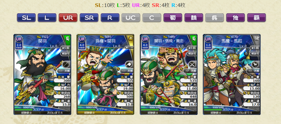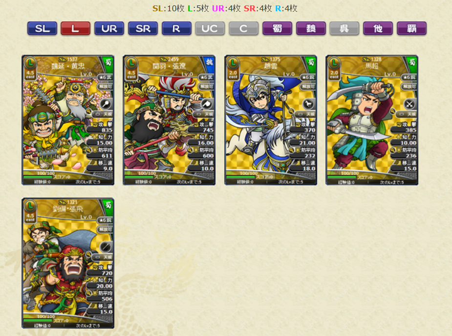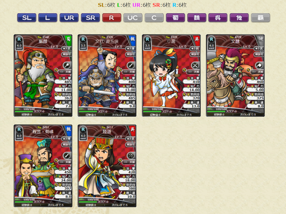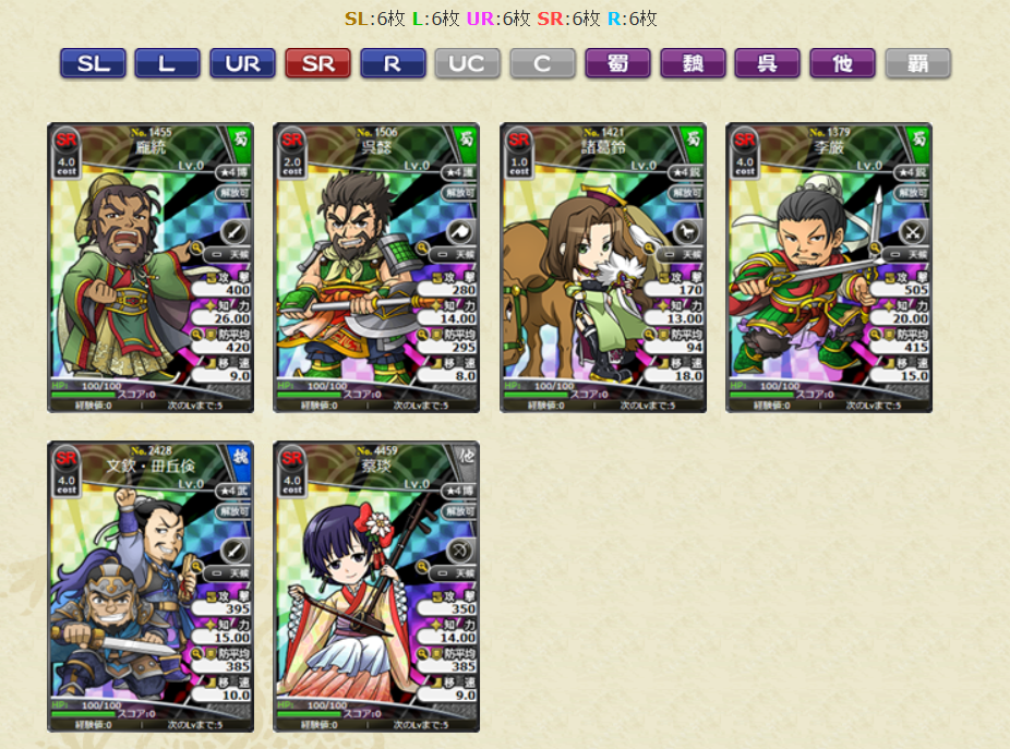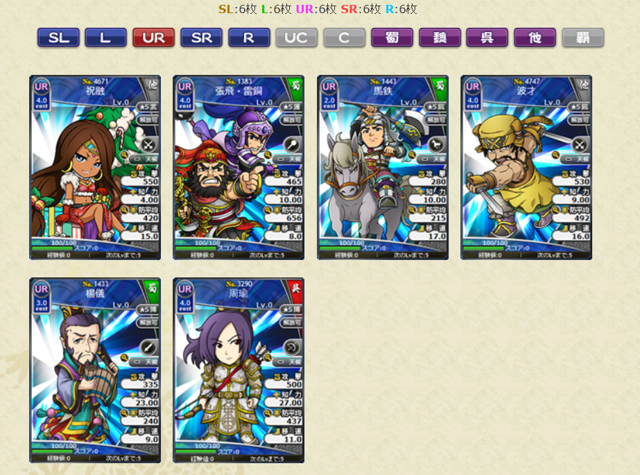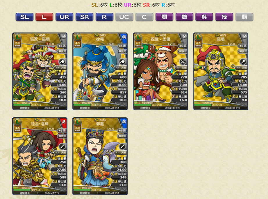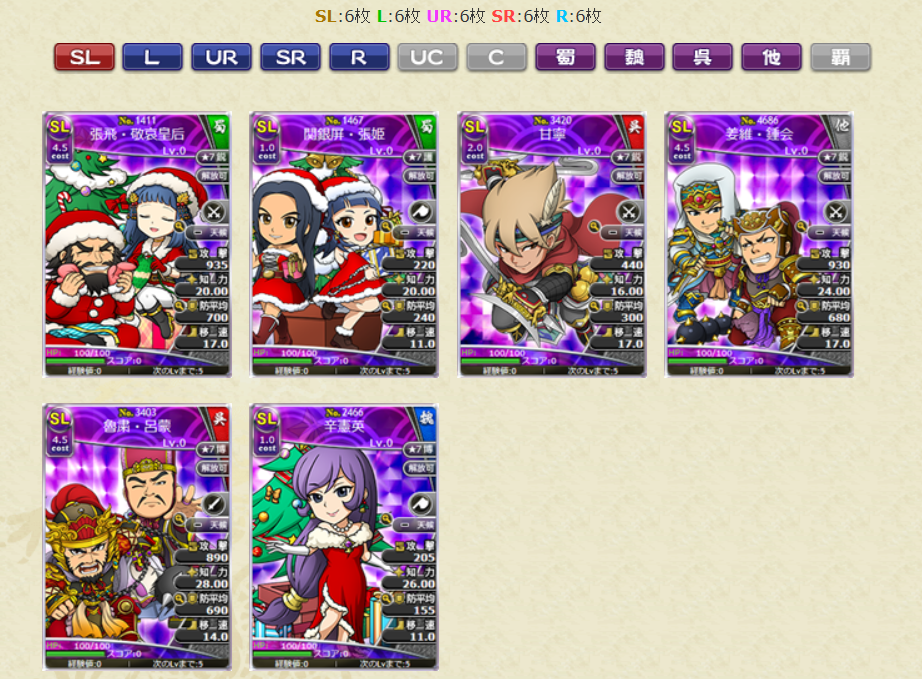 聖鐘の帝明鑑LV91枚 ・No.1468 SL劉禅 天帝檄令LV10 1枚 ・No.3483 SL小喬 聖夜の帝軍興LV10 1枚 ・No.4724 SL劉曼 副将の帝明鏡LV10 1枚 ・No.4595 SL水鏡 水鏡達識LV1 6枚 ブラウザ三国志のゲーム画面より引用