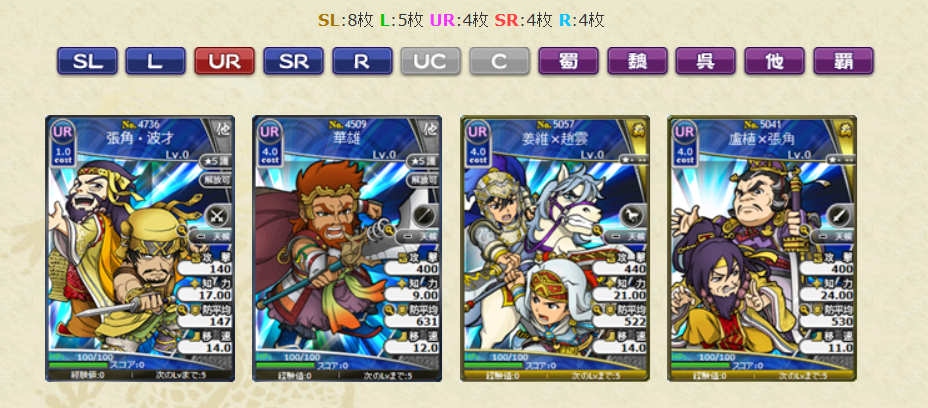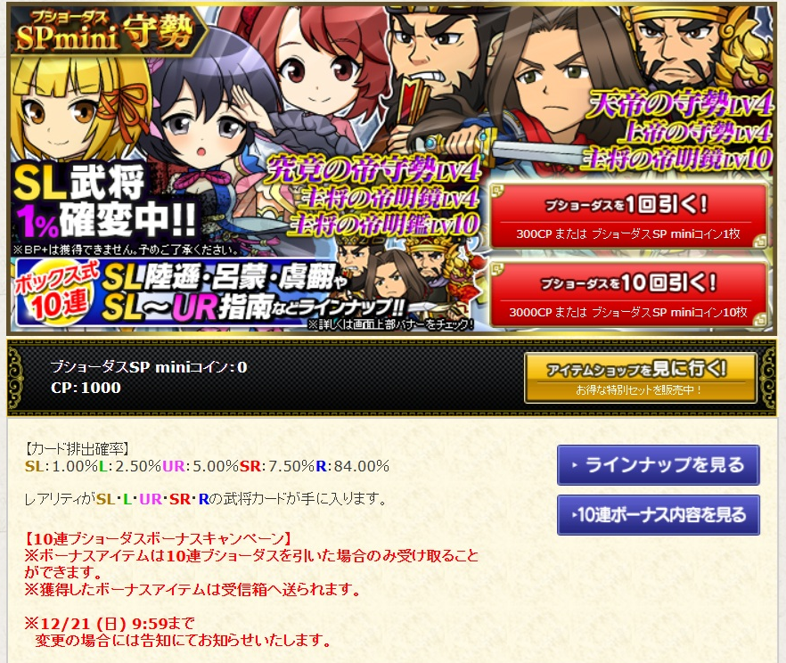 SL:1.00%、L:2.50%、UR:5.00%、SR:7.50%、R:84.00%※ブショーダスSPmini【守勢】で入手したカードを破棄しても、