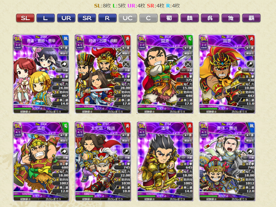 「No.2407 SL曹休・曹洪」なども再登場しています。また、今回のブショーダスSPmini【守勢】の各レアリティの排出確率は下記の通りです。