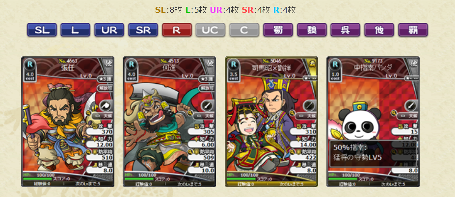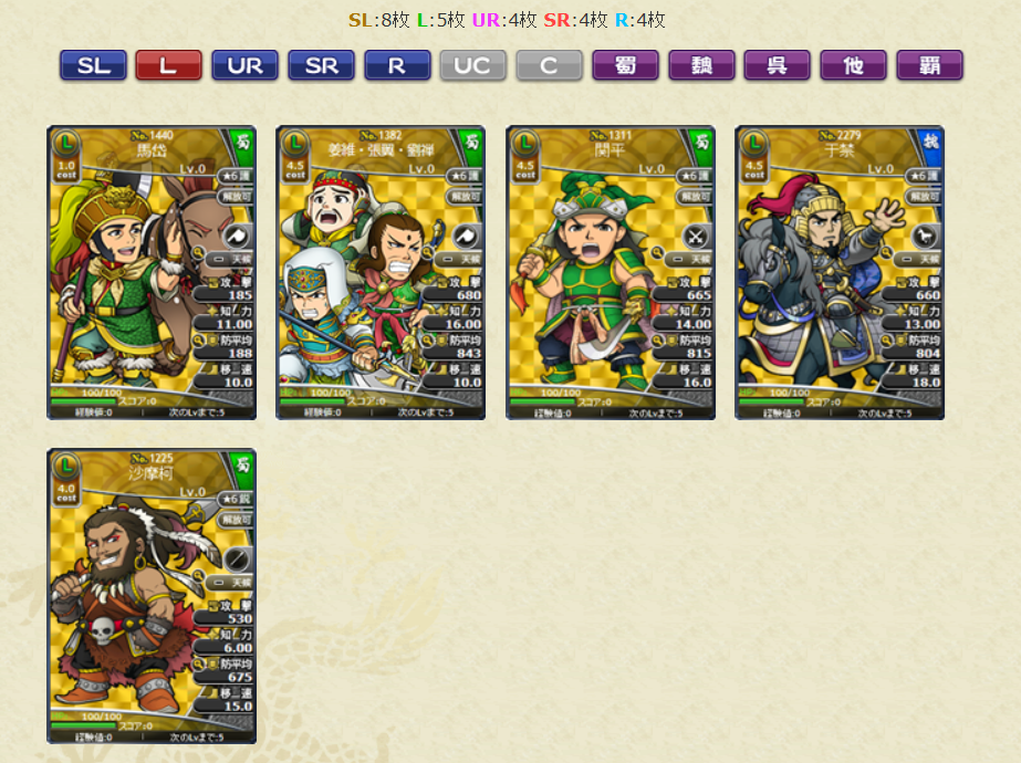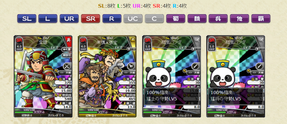 主将の天明鏡LV101枚 ・No.1311 L関平 獣神の守勢LV5 1枚 ・No.10737 SL指南パンダ 上帝の守勢LV5 1枚 ・No.10738 SL指南パンダ 炎帝の守勢LV5 1枚 ・No.10713 SL指南パンダ 天帝の守勢LV5 1枚 ・No.10656 L指南パンダ 獣神の守勢LV5 1枚 ・No.10509 L指南パンダ 龍神の守勢LV5 1枚 ・No.10348 UR指南パンダ 鬼神の守勢LV5 2枚 ・No.10469 UR指南パンダ 戦神の守勢LV5 2枚 ブラウザ三国志のゲーム画面より引用