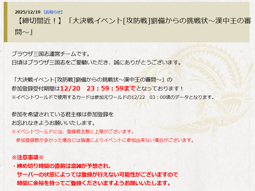 攻防戦「劉備からの挑戦状」の参加登録は今日の23時59分で終了しますよ。
