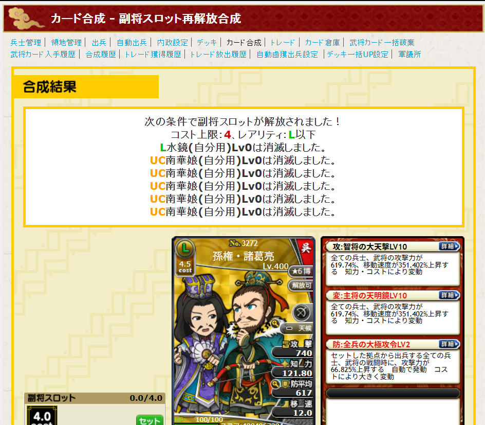 途中で2回失敗しましたが、ブーストカードのUC南華娘が無くなる前に終わって良かったです。
