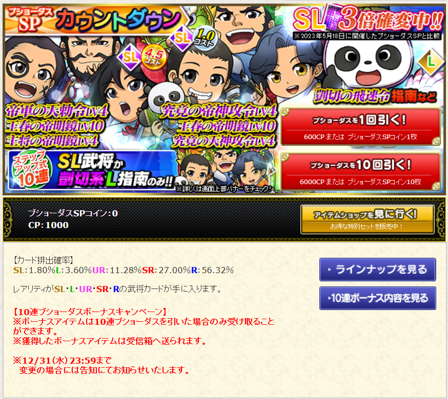 ブショーダスSP【カウントダウン】が開催中です。レアリティSLの武将カードでは