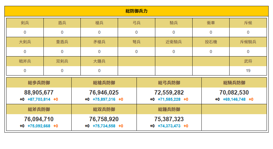 呉の防衛デッキの兵士無しの状態で防御力7000万前後。