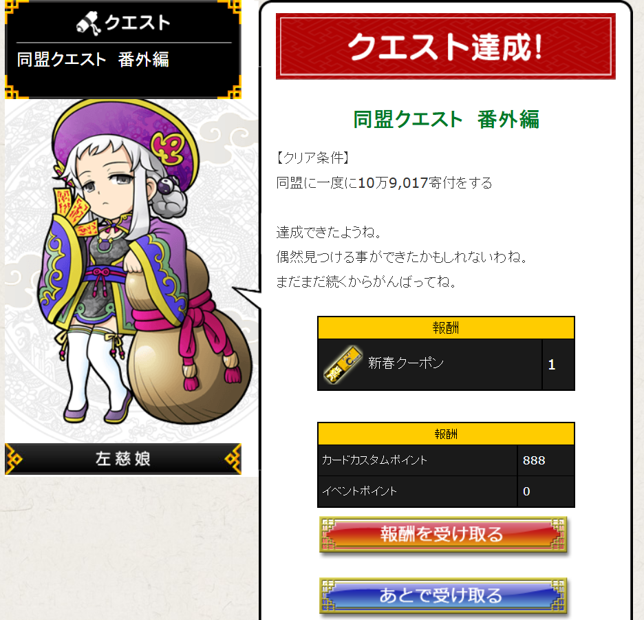 クリア条件である109017を寄付してクエストクリアでございます。