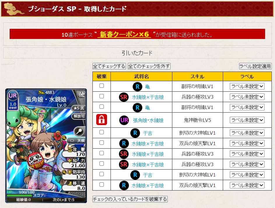 う~ん、URの檄令は嬉しいけど、呉に関連するカードじゃないから使えないのですよねえ(架空武将でも于吉娘なら無理やり呉関連だからと言えるのだけど)。