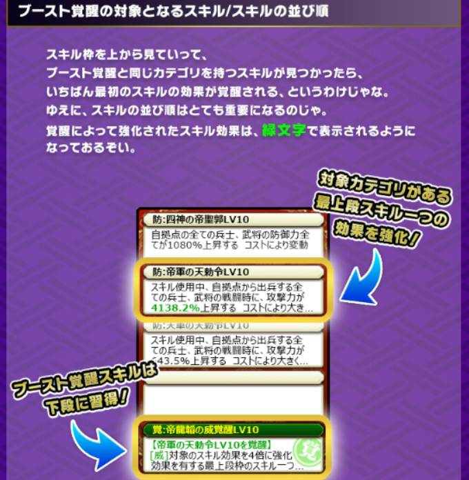 ブースト覚醒スキルは簡単に言うとスキル枠の上の方のアクティブスキルの対応する係数の効果を上げるというもの。