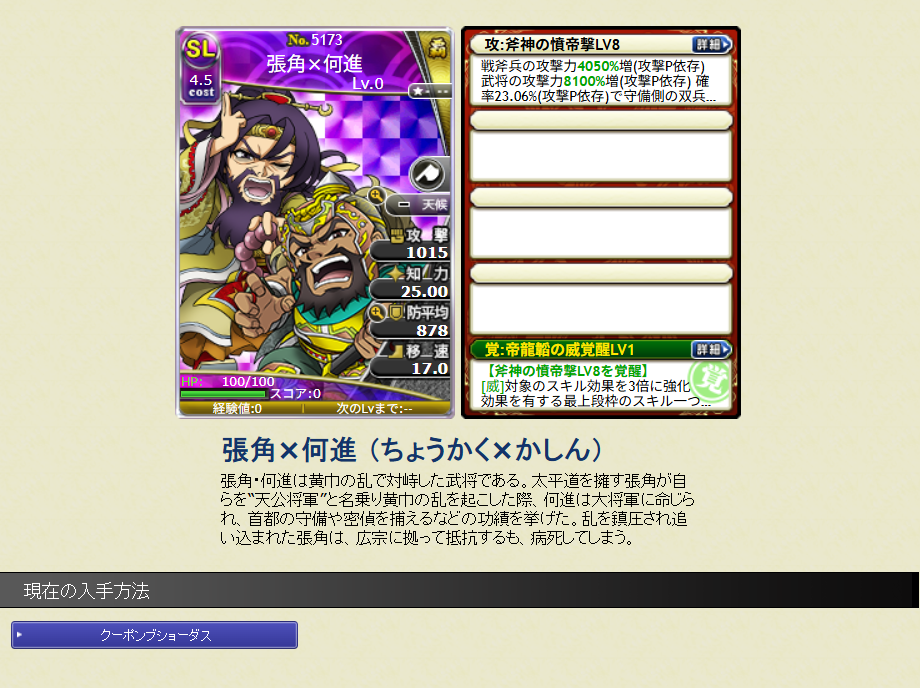 | SL張角×何進 | 4.5 | / | 斧神の憤帝撃・帝覚「威」 |