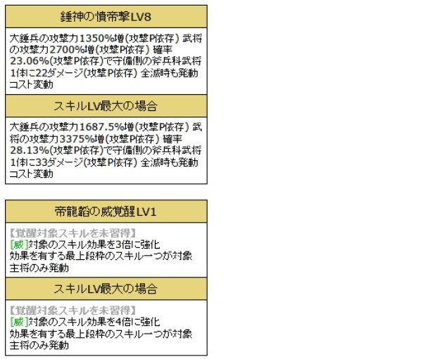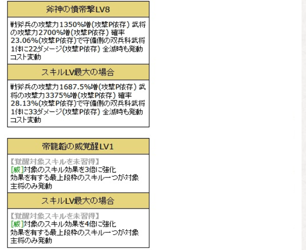 憤帝撃とブースト覚醒「威」どちらも最高レベルまで上げれば、斧兵科の兵の攻撃力6748%、武将の攻撃力1万3500%増となります。