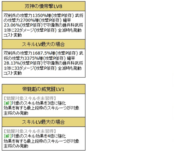 憤帝撃とブースト覚醒「威」どちらも最高レベルまで上げれば、双兵科の兵の攻撃力6748%、武将の攻撃力1万3500%増となります。