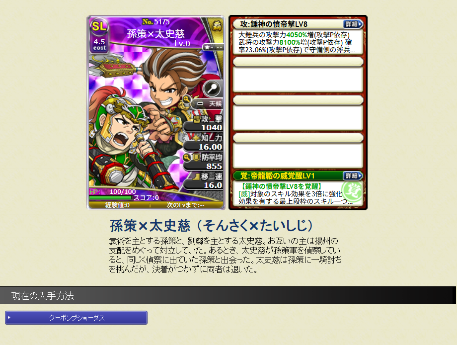 | SL孫策×太史慈 | 4.5 | / | 錘神の憤帝撃・帝覚「威」 |