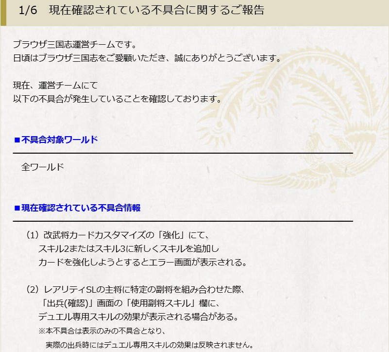 攻防戦が終わり、改武将の強化を考えている人多いと思うので、できるだけ早く不具合解消してほしいですわ。
