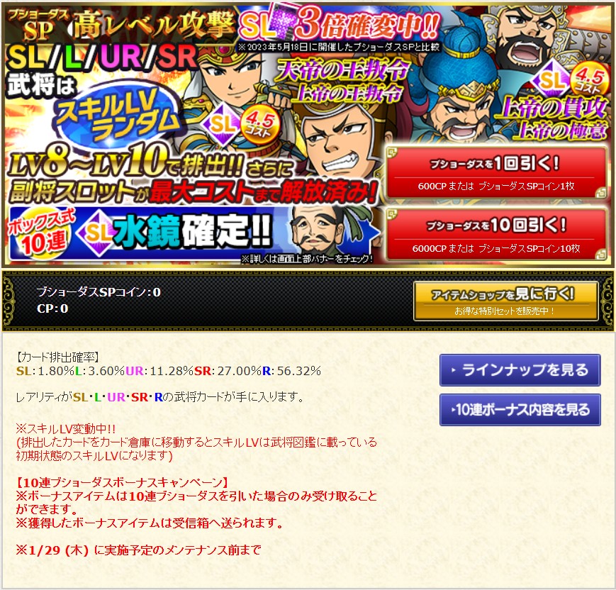 SL:1.80%、L:3.60%、UR:11.28%、SR:27.00%、R:56.32%10連ブショーダスを引くことで、引いたカードに加え