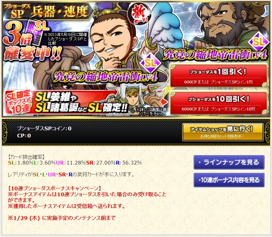 ブショーダスSP【兵器・速度】が開催中です。レアリティSLでは、