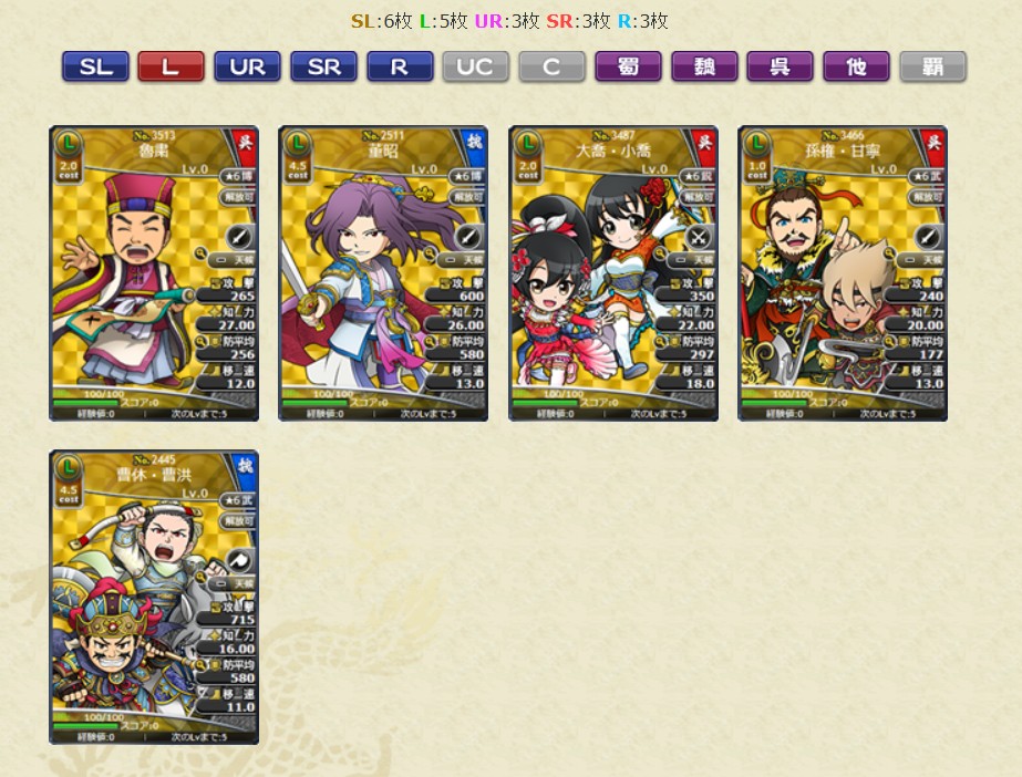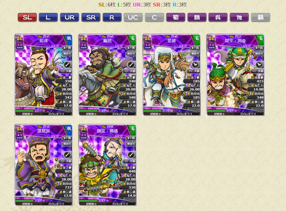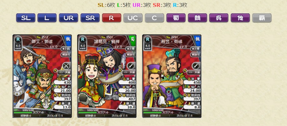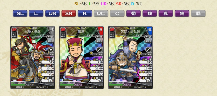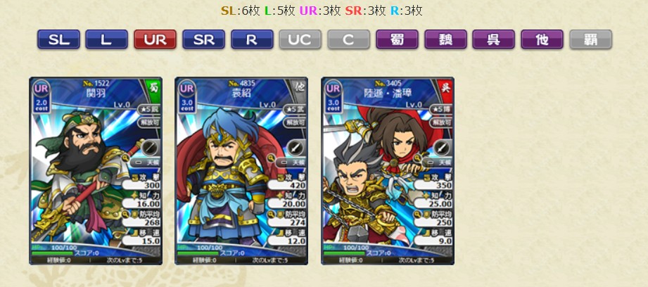 レアリティSL、L、UR、SRの武将カードは