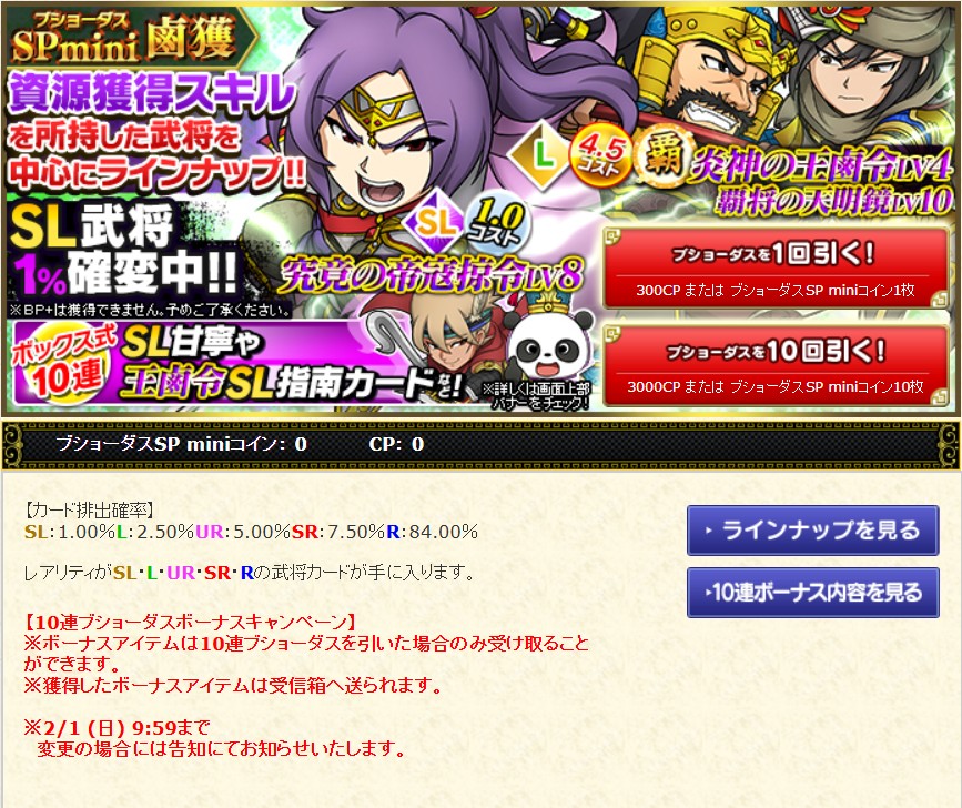 SL:1.00%、L:2.50%、UR:5.00%、SR:7.50%、R:84.00%※ブショーダスSPmini【鹵獲】で入手したカードを破棄しても、